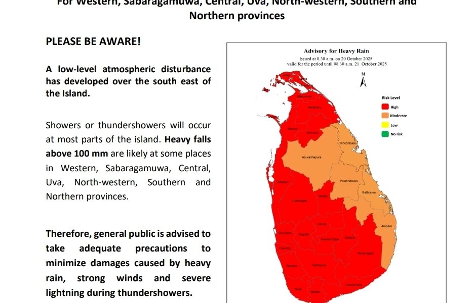Showers or thundershowers will occur at most parts of the island. Heavy falls above 100 mm are likely at some places in Western, Sabaragamuwa, Central, Uva, North-western, Southern and Northern provinces.