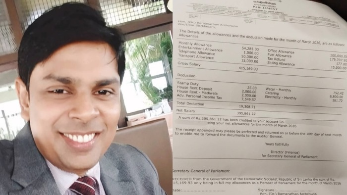 MP Ramanathan Archchuna has publicly shared his Parliament salary slip for March 2026, stating that the public should be aware of the earnings received by Members of Parliament.