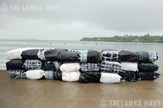 SLNS Vijaya belonging to the Northwestern Naval Command retrieved this haul of Kendu leaves in 41 sacks, during a search operation in the sea area. It is suspected that smugglers would have left behind the consignment due to heightened naval surveillance in the area.