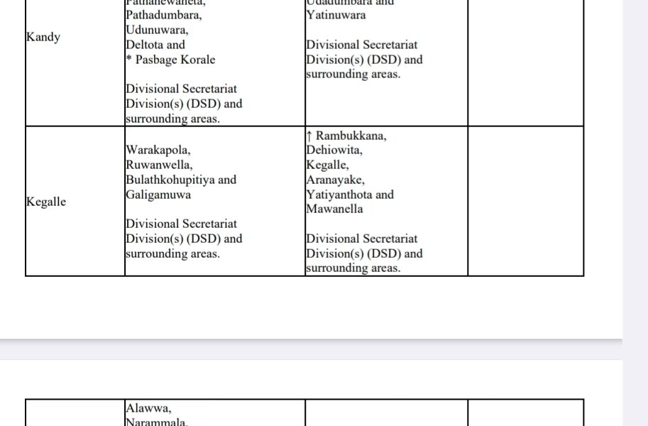 * **Level 2 (Amber Alert – Moderate Risk):** Areas such as Udapalatha, Doluwa, Pathadumbara, Udunuwara, Deltota, and Pasbage Korale in Kandy District, as well as Warakapola, Ruwanwella, Bulathkohupitiya, and Galigamuwa in Kegalle.
