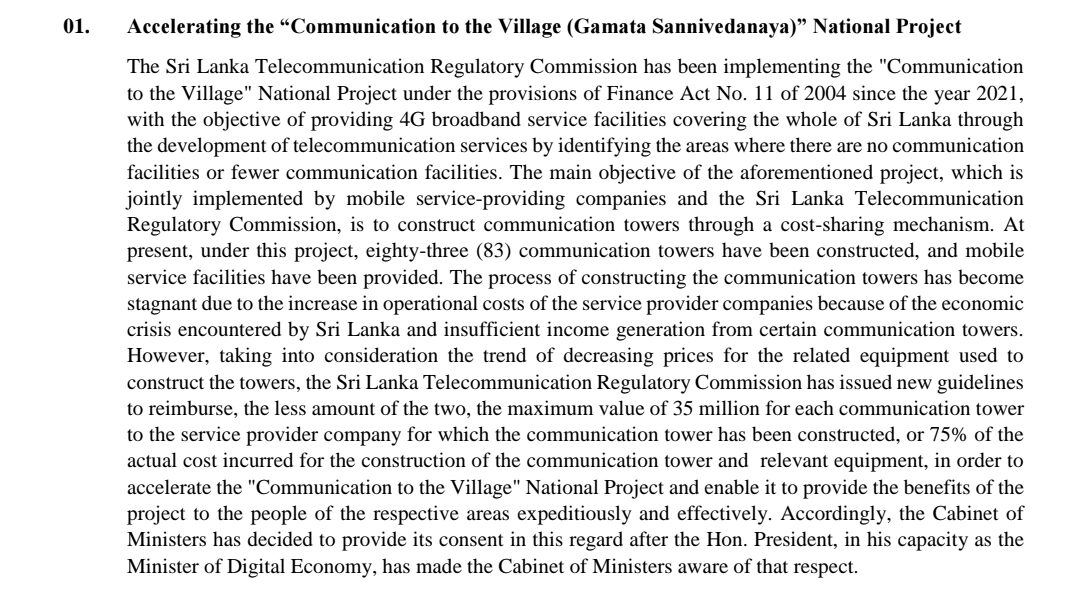 The Cabinet has approved new reimbursement guidelines to accelerate the “Communication to the Village” (Gamata Sannivedanaya) national project aimed at expanding 4G broadband coverage islandwide.
