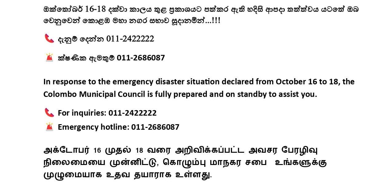 The Colombo Municipal Council (CMC) has declared an emergency disaster response from October 16 to 18, following forecasts of heavy rainfall and possible thunderstorms across Colombo and surrounding areas.