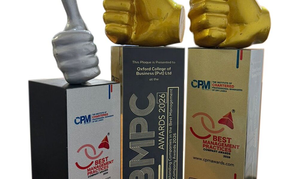Oxford College of Business (OCB), Sri Lanka’s leading private higher education provider, has once again reaffirmed its institutional excellence by securing multiple accolades at the prestigious Best Management Practices Company Awards 2026, organised by The Institute of Chartered Professional Managers of Sri Lanka.
