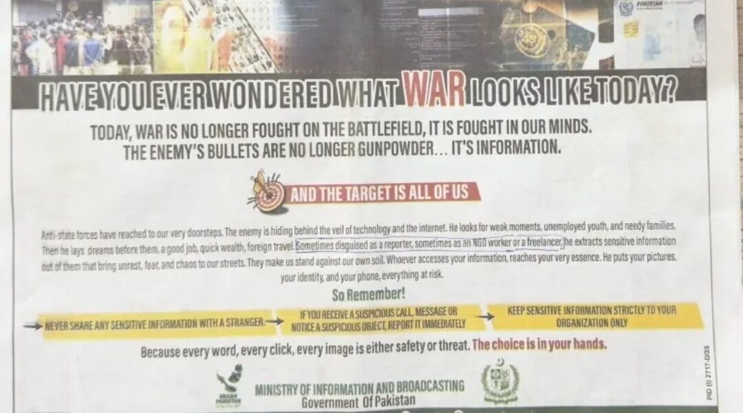 Media watchdog Freedom Network, the Human Rights Commission of Pakistan (HRCP), and other rights groups have condemned a government advertisement in major newspapers for portraying journalists, freelancers, NGO workers, and civil society actors as “threats” or instruments of “enemy propaganda” under the label of “information warfare.”