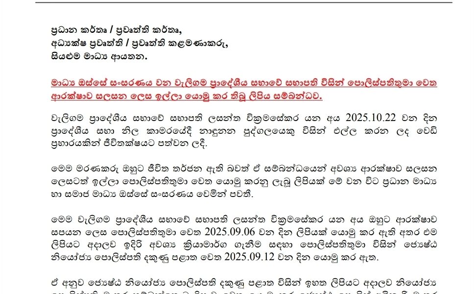 Police Headquarters has confirmed that Weligama Pradeshiya Sabha Chairman Lasantha Wickramasekara, who was shot dead this week, had written to the Inspector General of Police (IGP) in early September requesting protection after receiving death threats.