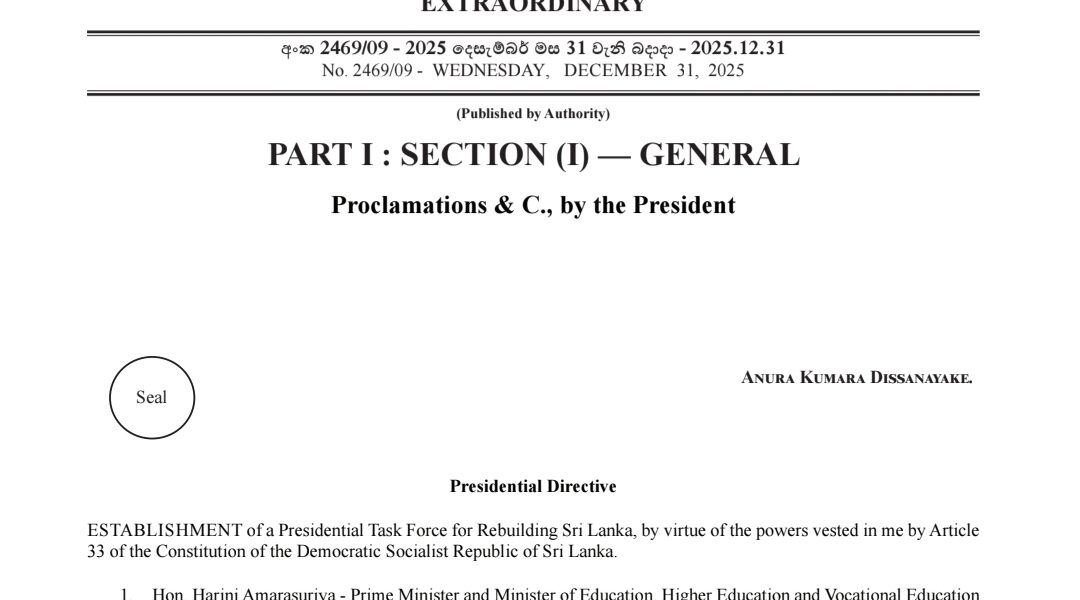 President Anura Kumara Dissanayake has issued an Extraordinary Gazette establishing a Presidential Task Force for Rebuilding Sri Lanka, aimed at coordinating post-disaster rehabilitation, recovery and reconstruction efforts following the devastation caused by Cyclone Ditwah.