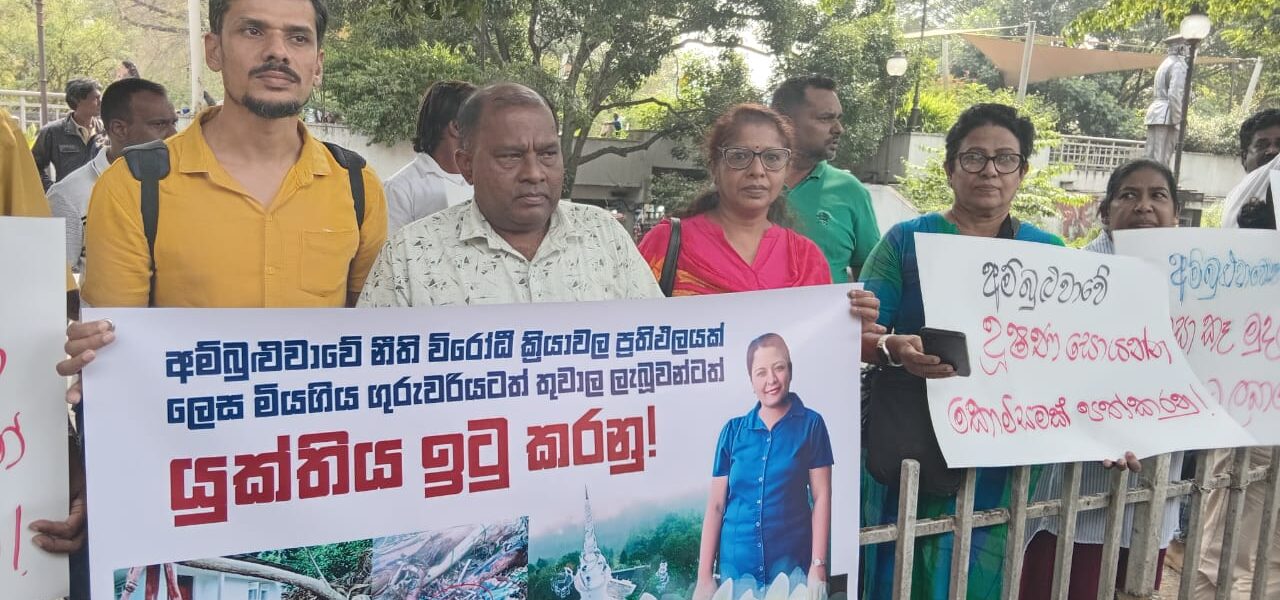 A group of civil activists in Kandy staged a protest today, demanding legal action against those responsible for environmental destruction in the Ambuluwawa area and calling for the repeal of the Ambuluwawa Act.