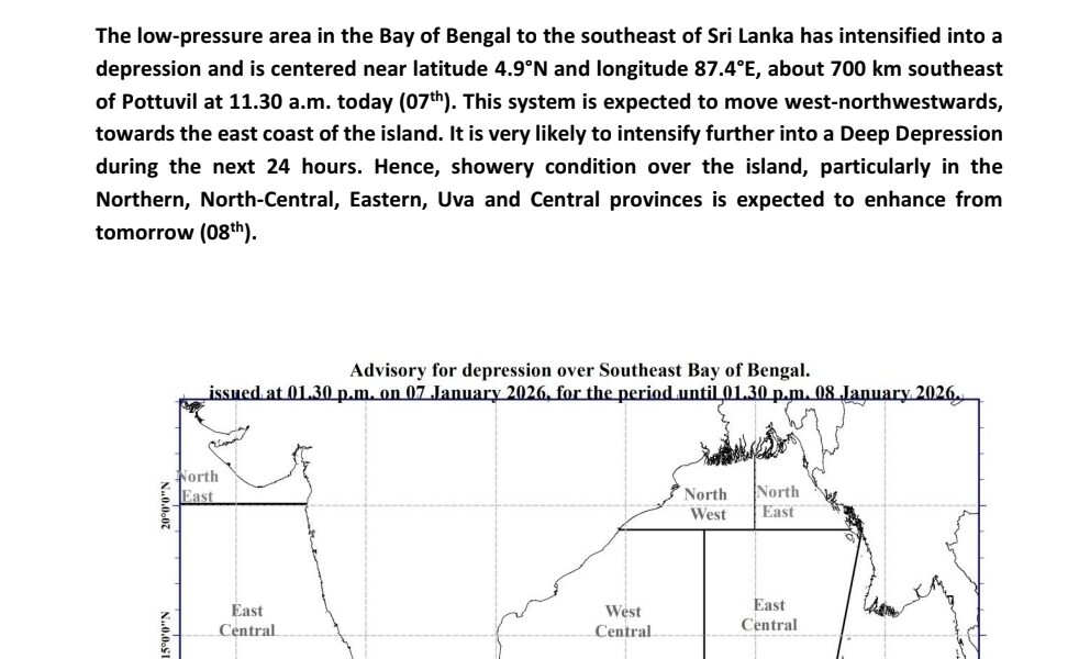 The low pressure area off the southeast coast over the Bay of Bengal is likely to intensify into a deep depression during the next 24 hours. Heavy rains of up to 100mm are likely to occur at some places in the Northern, North Central, Eastern, Uva and Central provinces.