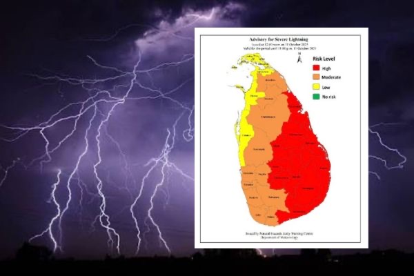 Severe lightning and thundershowers are expected in the Eastern, Uva, and Central provinces, as well as in Polonnaruwa and Hambantota districts until 11:00 p.m. on 11 October 2025, the Department of Meteorology has warned.