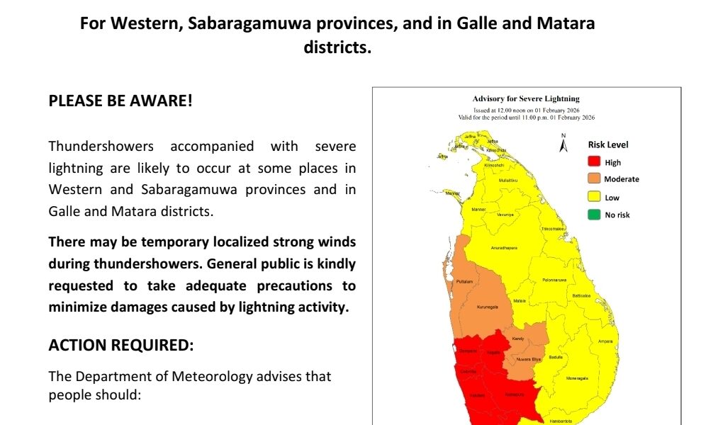 Thundershowers accompanied with severe lightning are likely to occur at some places in Western and Sabaragamuwa province and in Galle and Matara districts.