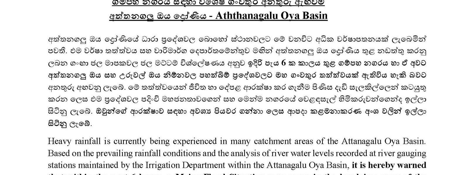 The Irrigation Department has issued a Red Flood Warning for the Attanagalu Oya Basin, warning that a major flood situation may occur in low-lying areas within the next six hours due to heavy rainfall in the catchment.