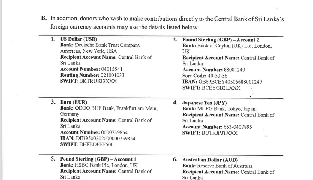 The Ministry of Finance has released official bank details for anyone wishing to contribute to Sri Lanka’s disaster relief efforts.