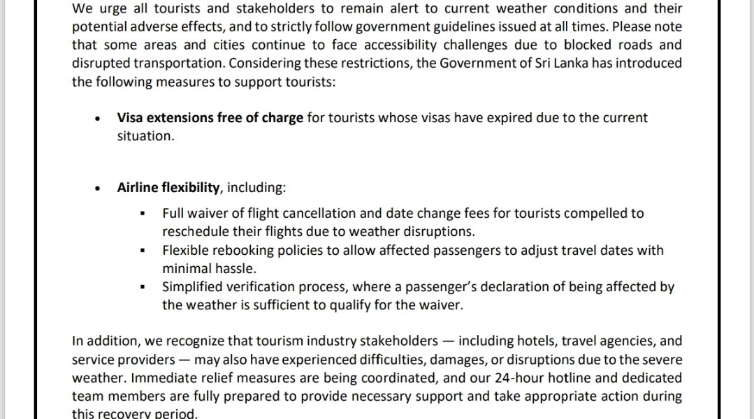 Sri Lanka has announced special support measures for tourists affected by the ongoing severe weather, including free visa extensions and flexible airline policies to ease travel disruptions.