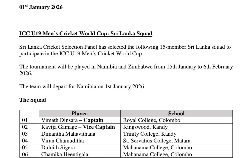 Sri Lanka Cricket Selection Panel has selected the following 15-member Sri Lanka squad to participate in the ICC U19 Men’s Cricket World Cup.