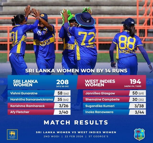 Sri Lanka’s women’s cricket team clinched a historic ODI series victory in the Caribbean, defeating the West Indies Women by 14 runs in the second ODI on Sunday (22) to take an unassailable 2-0 lead in the series.