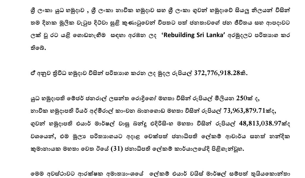 The post Sri Lanka’s Tri-Forces donate one day’s salary, Rs. 372 mn, to Rebuilding Sri Lanka Fund appeared first on Newswire.