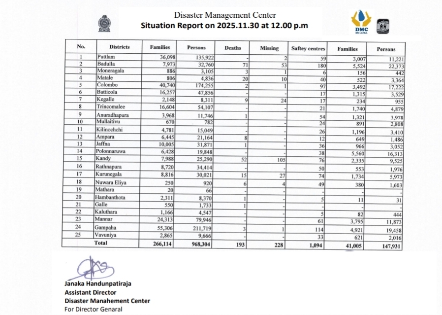 The DMC also confirmed that 228 people remain missing as rescue and search operations continue in multiple districts hit by flooding, landslides, and widespread destruction. More than 968,000 individuals from 266,114 families have been affected islandwide.
