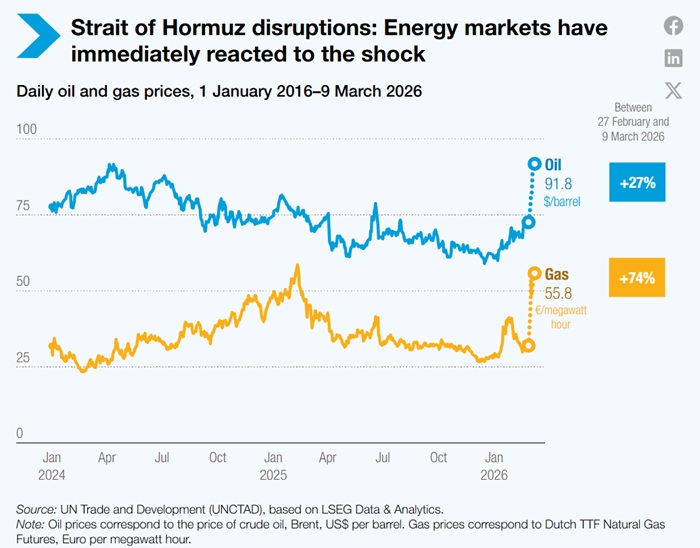 • Socio-economic implications for developing economies: Many developing countries already face high debt service burdens, limited fiscal space and constrained access to finance. In this context, rising energy, transport and food costs could strain public finances and increase pressure on household budgets, potentially heightening economic and social pressures and complicating progress toward sustainable development, particularly in economies heavily dependent on imported energy, fertilizers and staple foods. (Newswire)