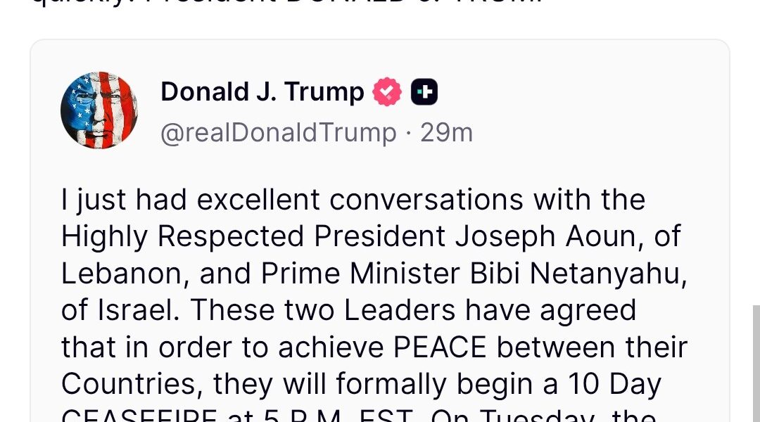 The post Trump: Israel, Lebanon Agree to 10-Day Ceasefire appeared first on Newswire.
