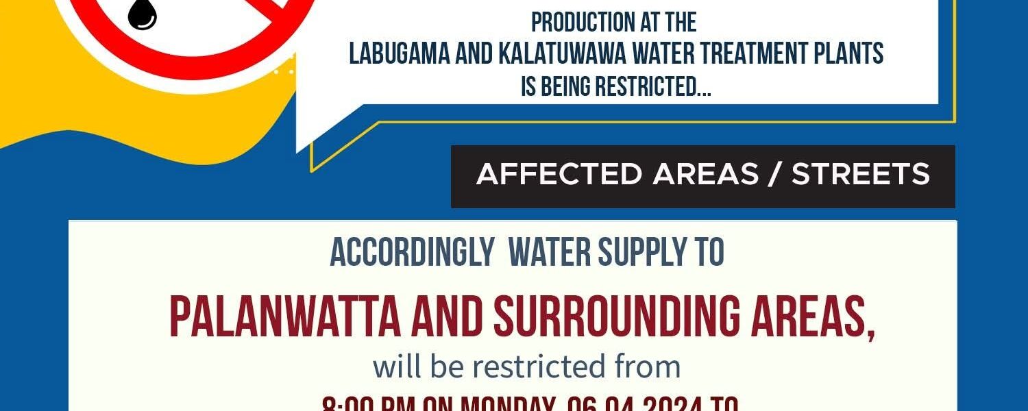 Accordingly, water supply to Palanwatta and surrounding areas will be restricted during the 12-hour period.