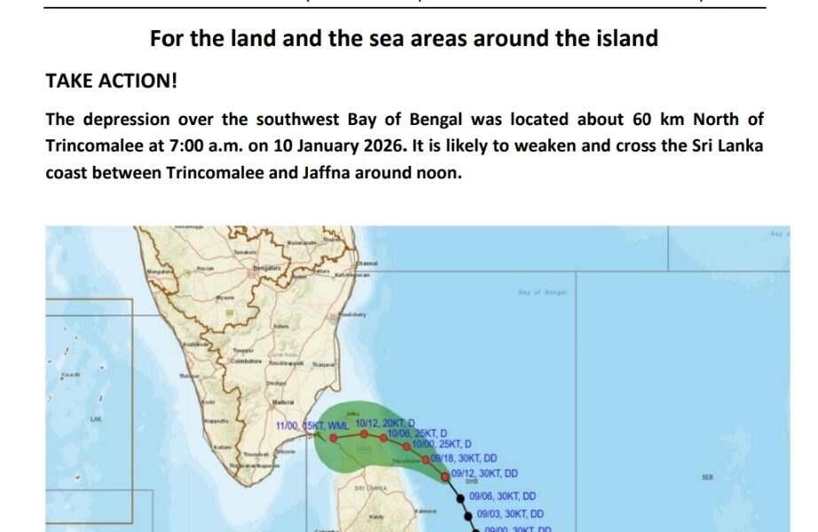 The depression over the southwest Bay of Bengal was located about 60 km North of Trincomalee at 7:00 a.m. on 10 January 2026. It is likely to weaken and cross the Sri Lanka coast between Trincomalee and Jaffna around noon.