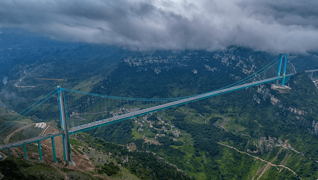 Spanning the Huajiang section of the Beipan River, the Huajiang Grand Canyon Bridge has a deck 625 meters above the water and a main span of 1,420 meters, making it the longest main span for a bridge in mountainous terrain.